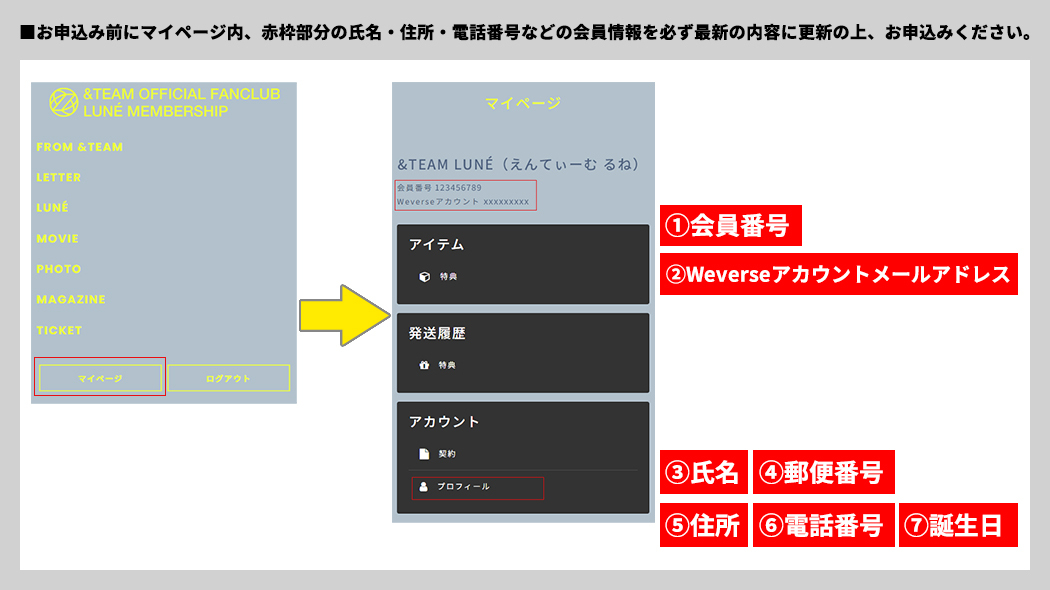 ※お申込みの際、ご入力いただく情報は必ず&TEAM OFFICIAL FANCLUB LUNÉ MEMBERSHIPにご登録の情報をご入力ください。ご登録の情報は、&TEAM Weverse > さらに表示( ⋮ ) > メンバーシップにてご確認いただけます。